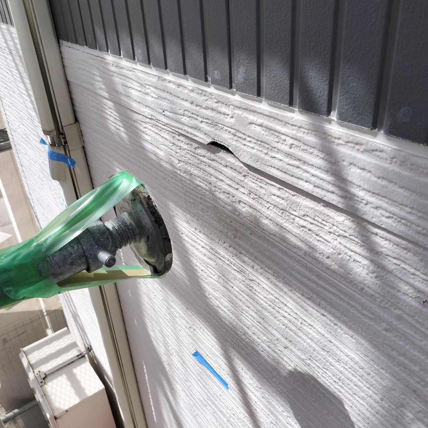 - 今回は事務所の外壁(ニチハサイディング14mm)の施工でした。<div>暑い中コーキング屋さんにも頑張って頂いています!</div>